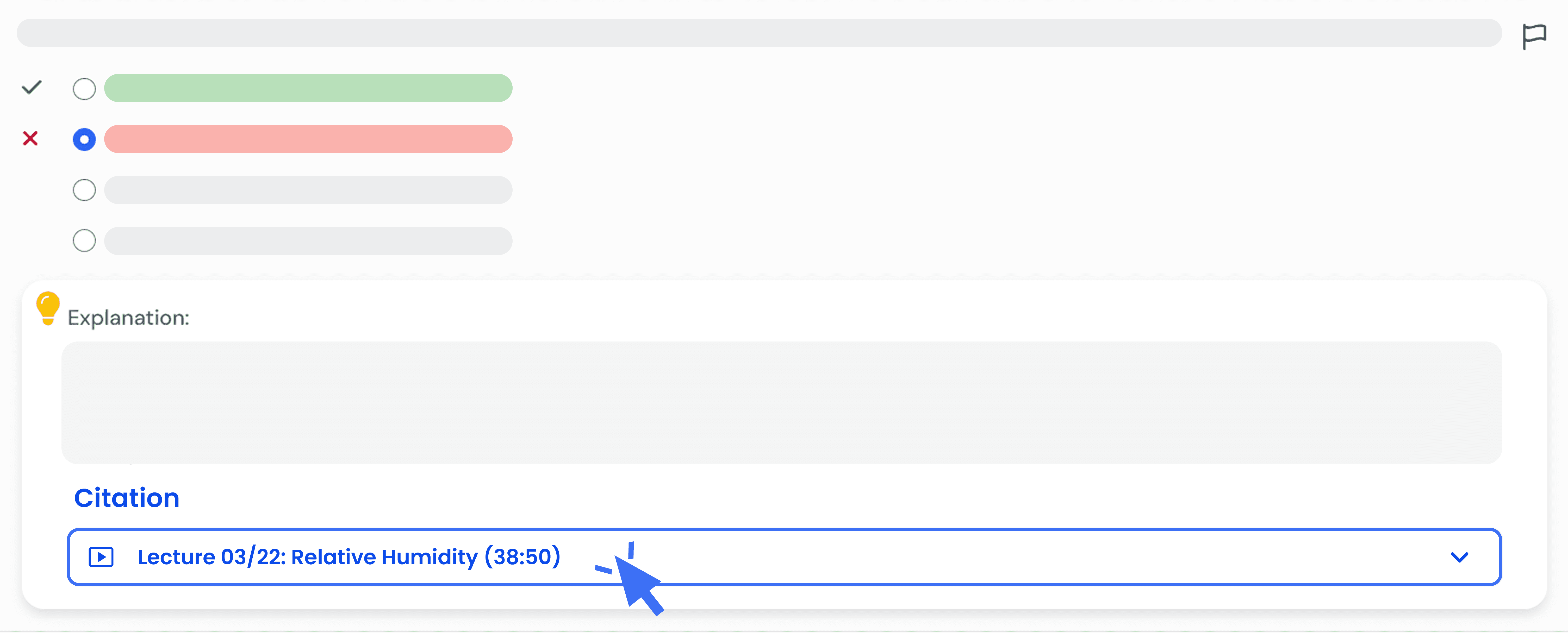 In addition to receiving clear explanations for each right and wrong answer upon quiz submission, PracticeClues now provides citations that show exactly where the content for that question was pulled from in your lectures!