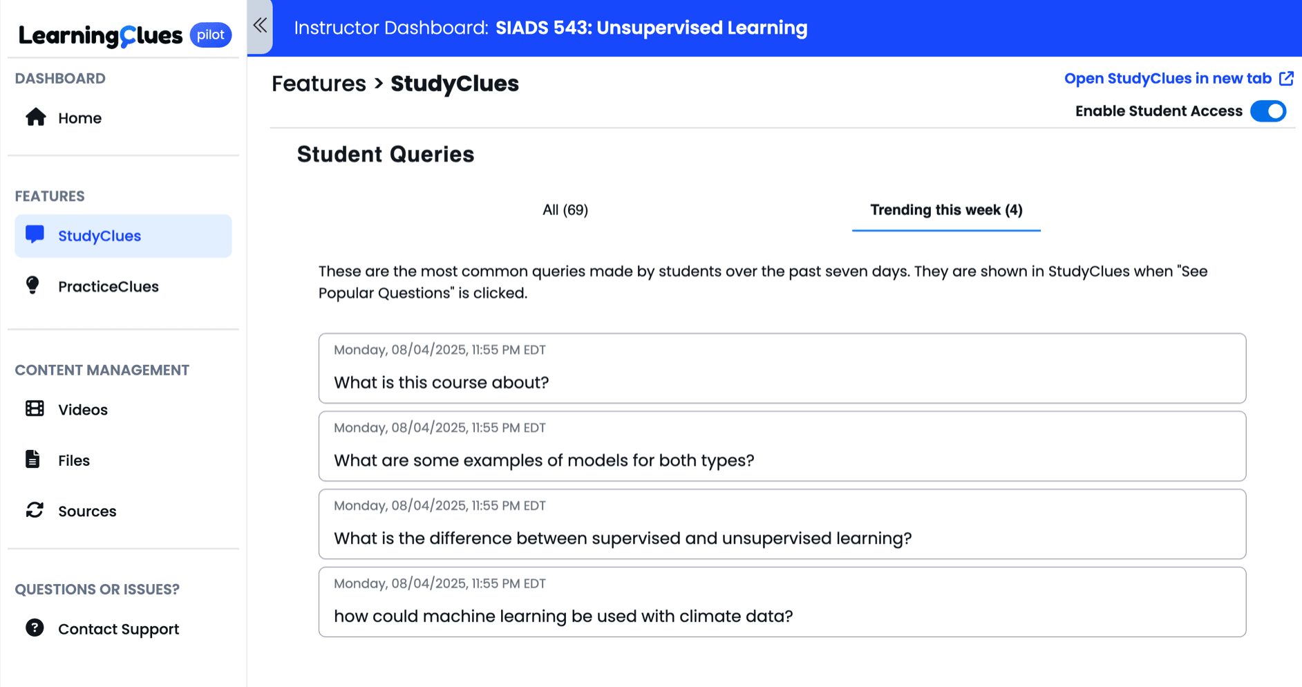 LearningClues provides faculty with insights into student engagement. You can view anonymized data on the most frequently asked questions by your students. This data can be incredibly valuable for:
