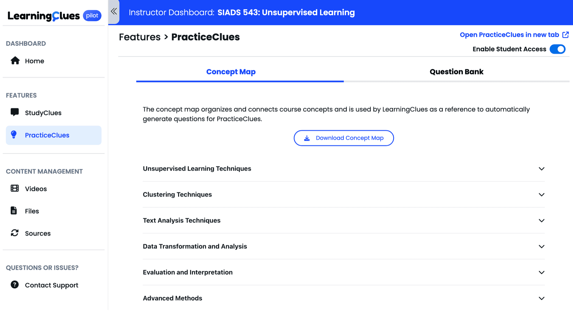 Syllabus for Concept Maps: A well-structured syllabus is not only vital for StudyClues but also foundational for PracticeClues' concept mapping feature. LearningClues can automatically generate concept maps (learning objectives) directly from your syllabus, which then drive personalized practice questions. We highly recommend this automatic process for efficiency, though manual creation is also an option (more details on this in Section 3).