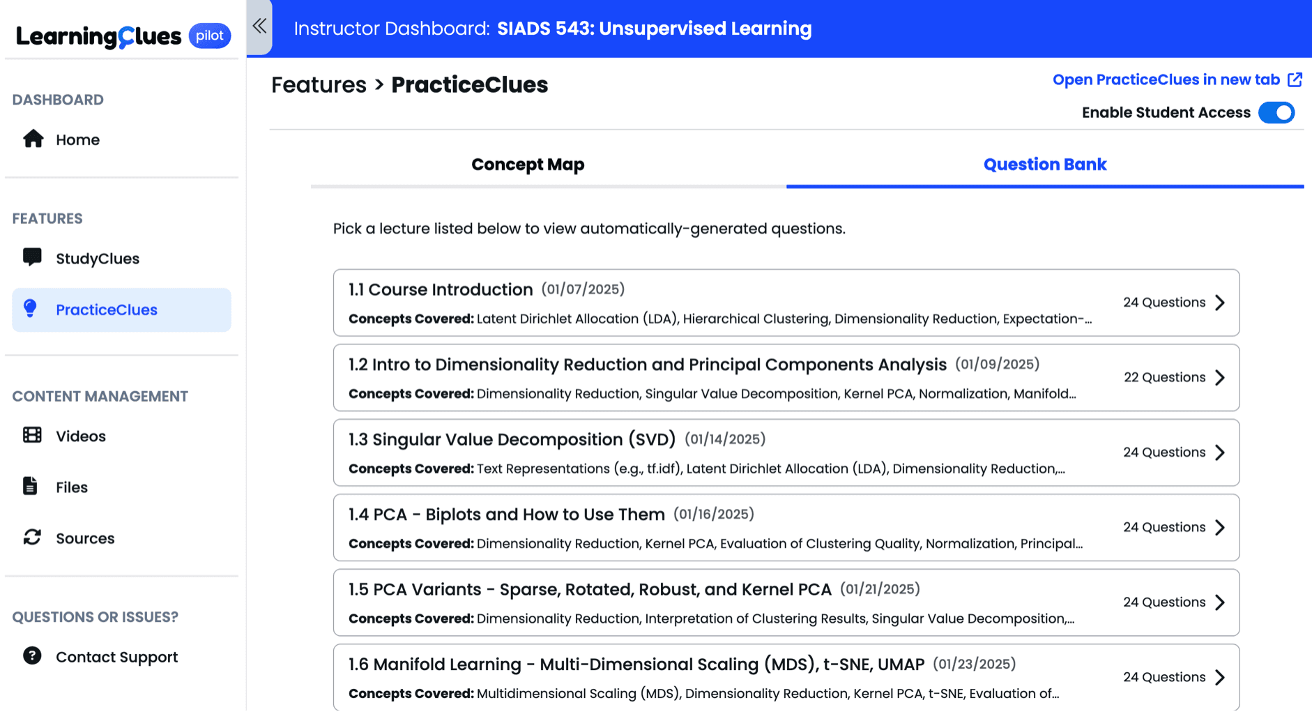 You will have the opportunity to review these AI-generated practice questions. It is crucial to understand that these question banks are fully editable. You have complete control to remove questions to ensure their quality, accuracy, and pedagogical relevance. After a new lecture is added to the LearningClues system and has been processed, questions are immediately generated and are automatically released to students 24hrs later.