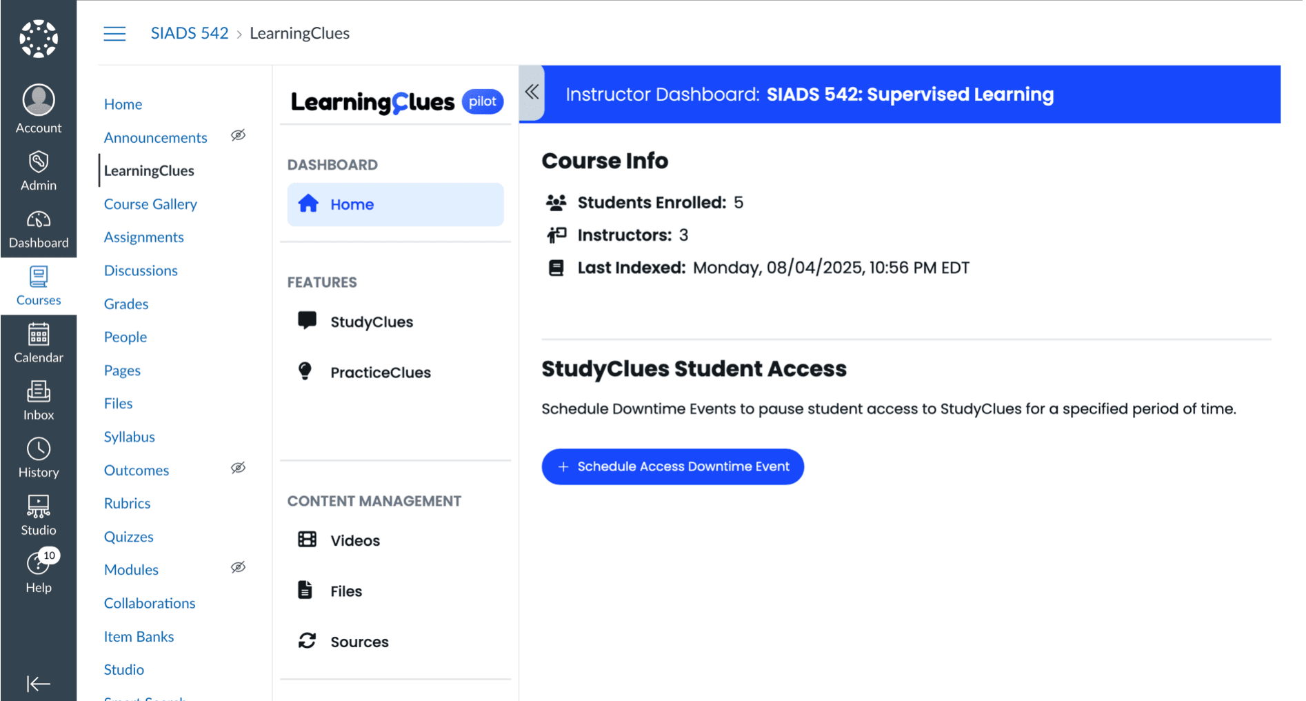 Recommendation for Exams: We strongly recommend scheduling downtime for LearningClues during exams, particularly for online assessments. This prevents students from using the tool to look up answers during a timed, proctored assessment, maintaining academic integrity. You can manage LearningClues availability through the instructor dashboard within the LearningClues interface in your course. (Specific instructions or a link to a quick guide will be provided here.)