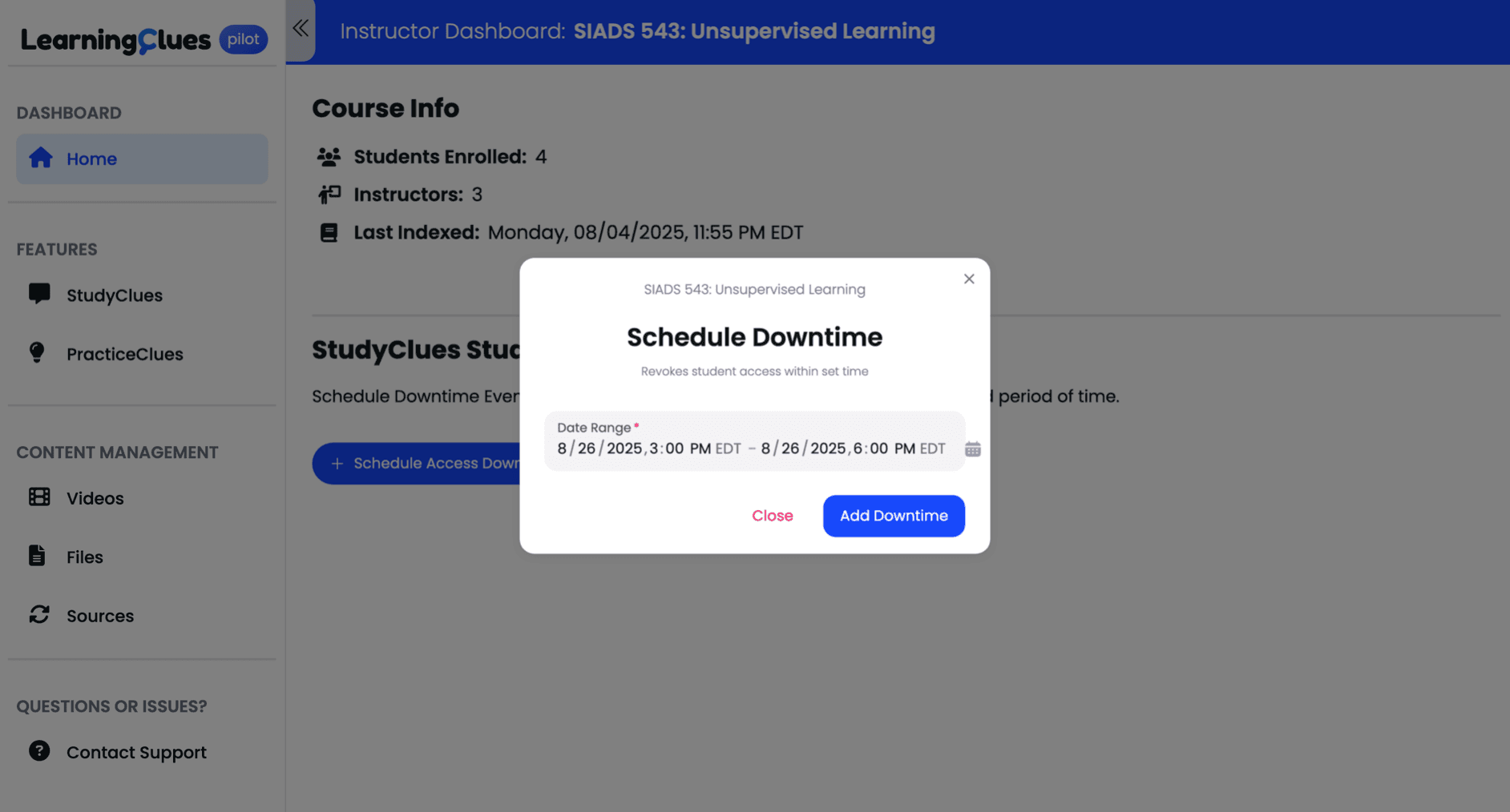 Professor's Discretion: You have the ability to schedule downtime for LearningClues, effectively turning off its functionality for specific periods.