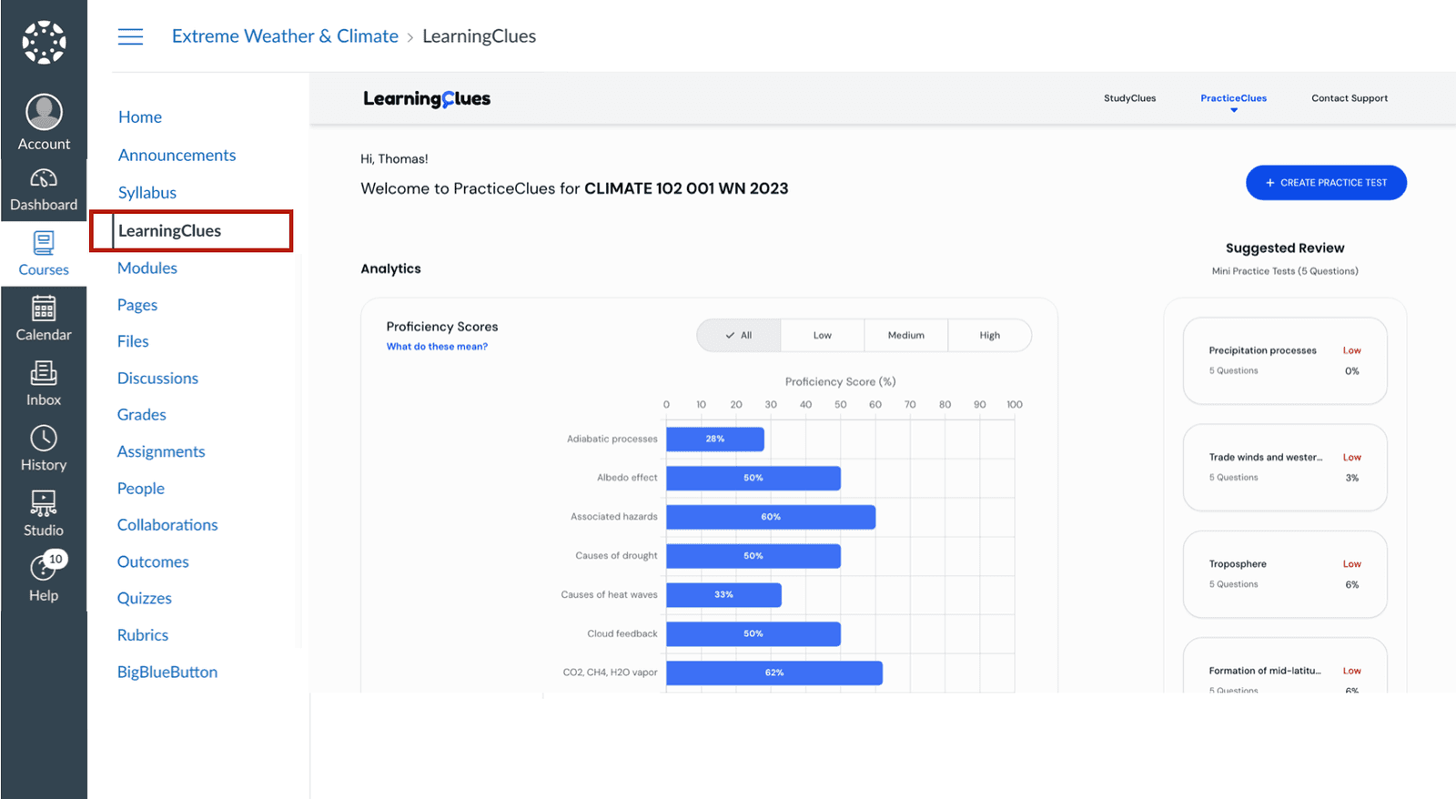 To get started, navigate to your course in your Learning Management System (LMS). Let’s use Canvas for this example. You will find the link to LearningClues on the sidebar. Clicking on it will take you to the PracticeClues interface.