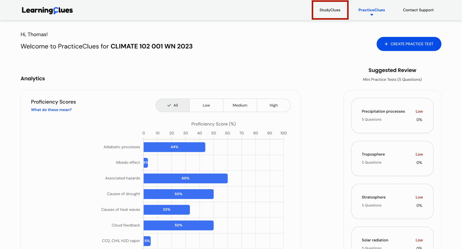 StudyClues: You can jump directly to the StudyClues application using the top bar. StudyClues is our 24/7 chatbot that allows you to ask questions about course content.