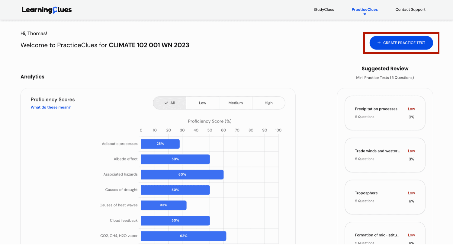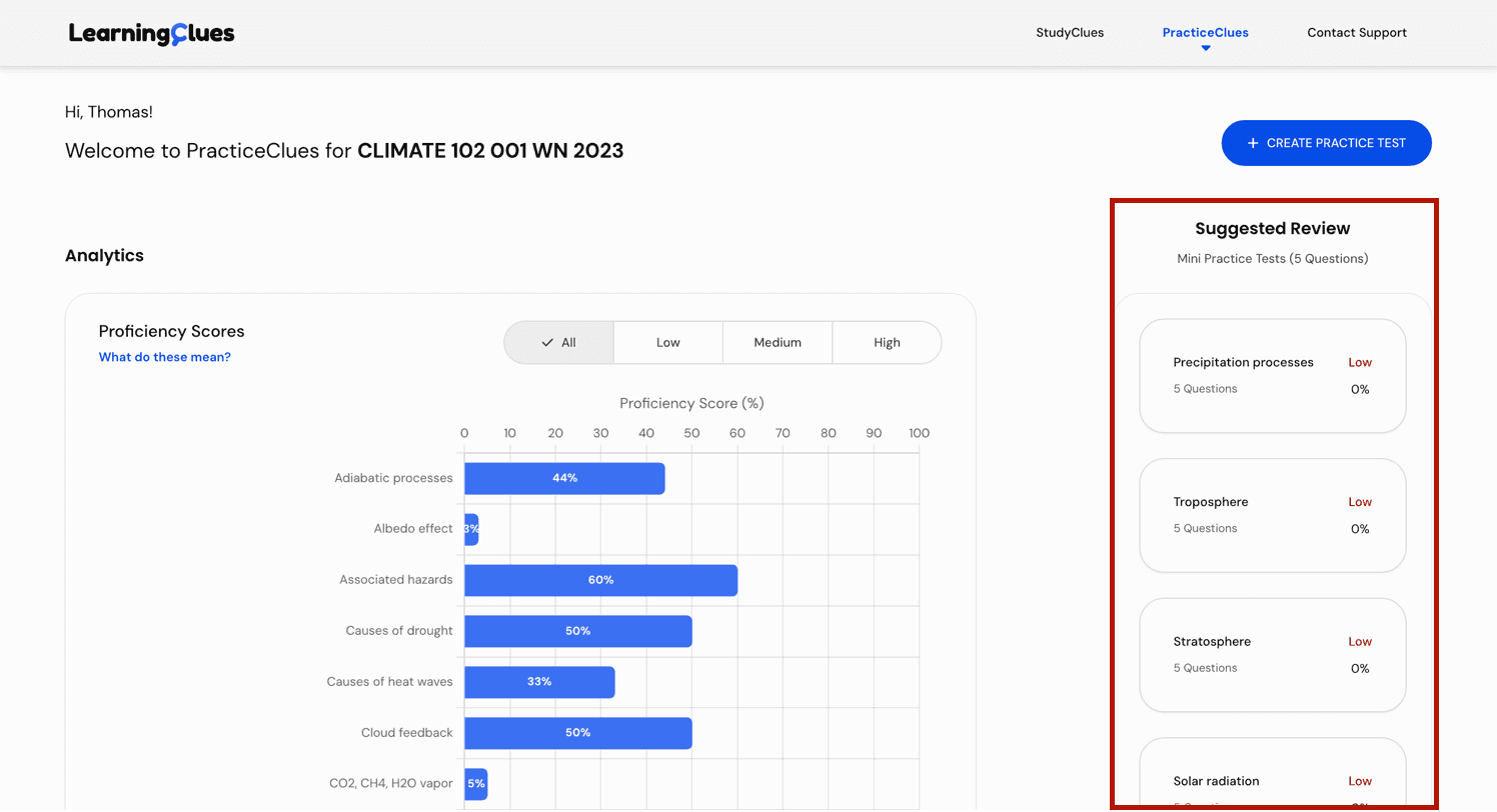 PracticeClues is an adaptive learning tool that allows you to take practice tests based on the concepts and learning objectives from your course. Your instructor sets up these objectives, and, as new content is added to the course, PracticeClues automatically generates questions from that material. This helps you practice and improve your proficiency in each area of study.