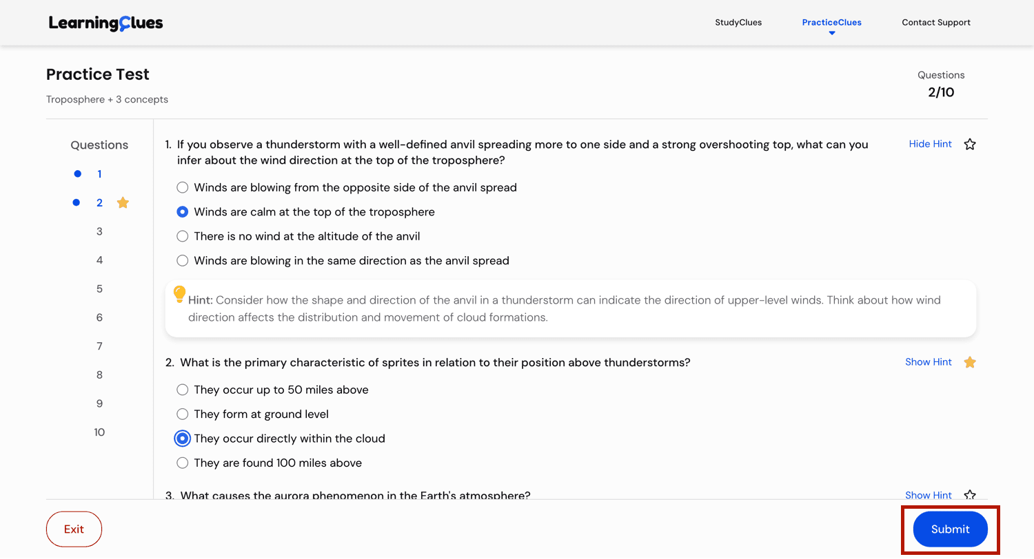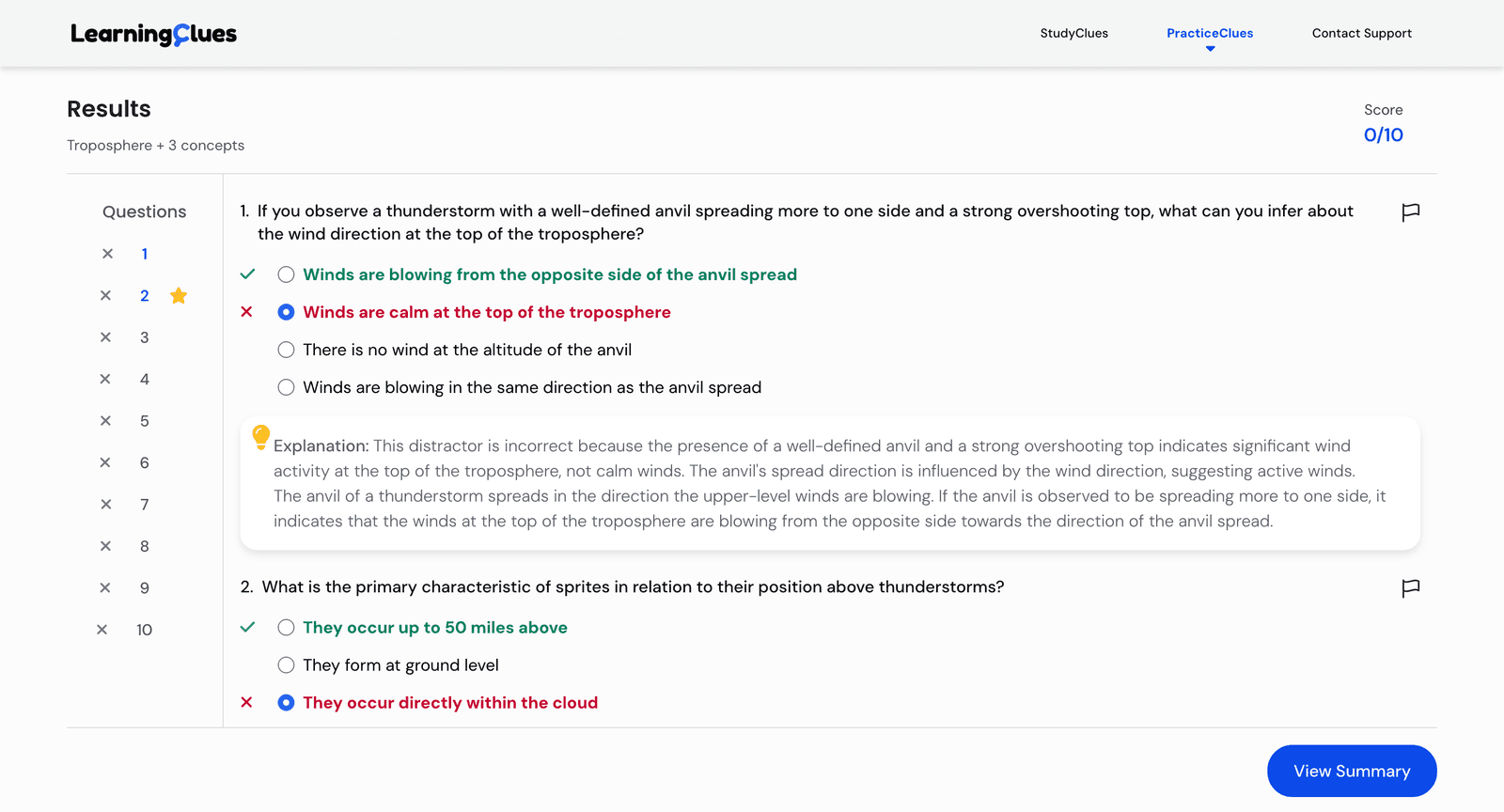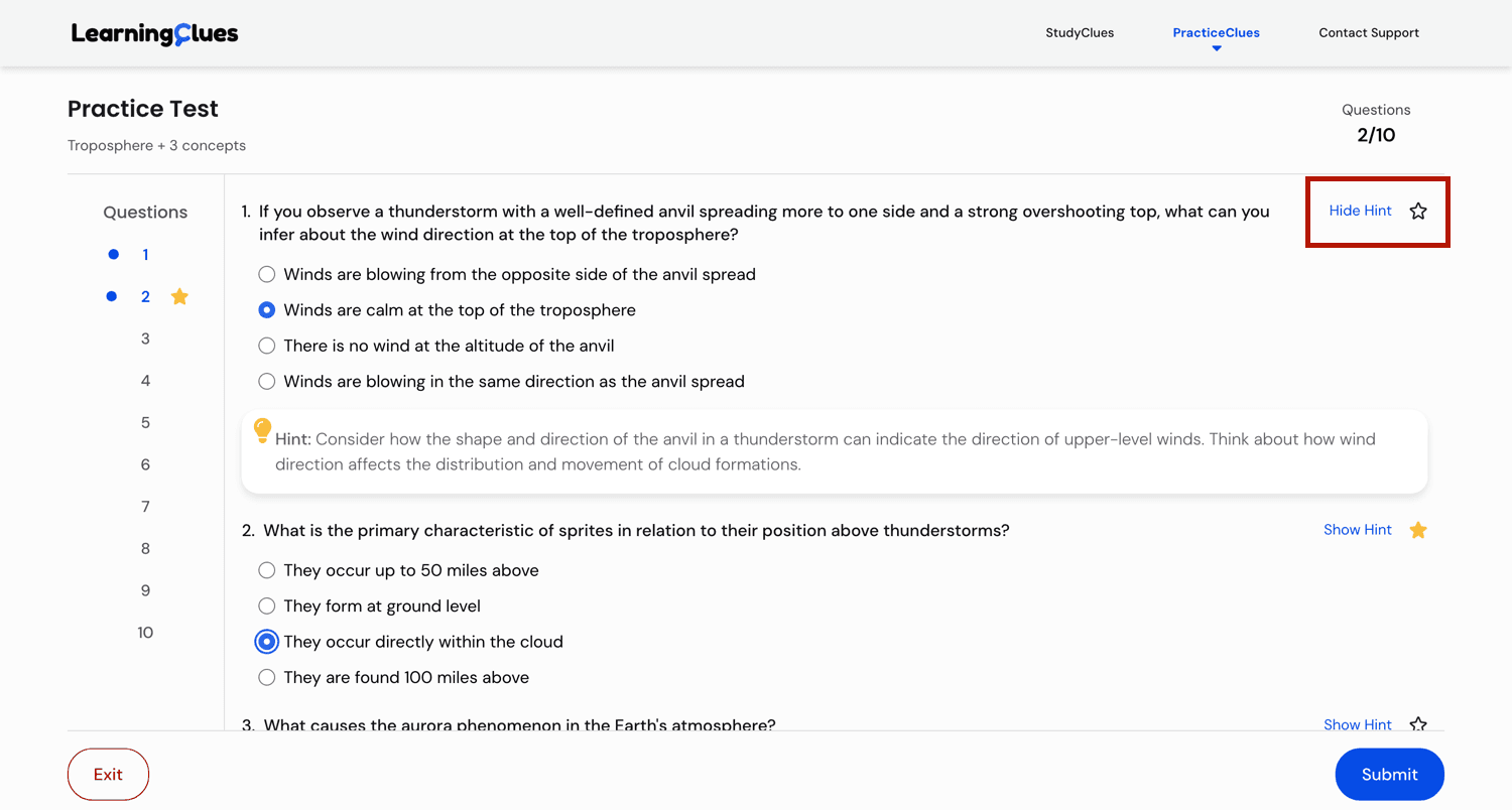 PracticeClues will generate a practice test for you based on your selected topics. As you go through the test, you can: