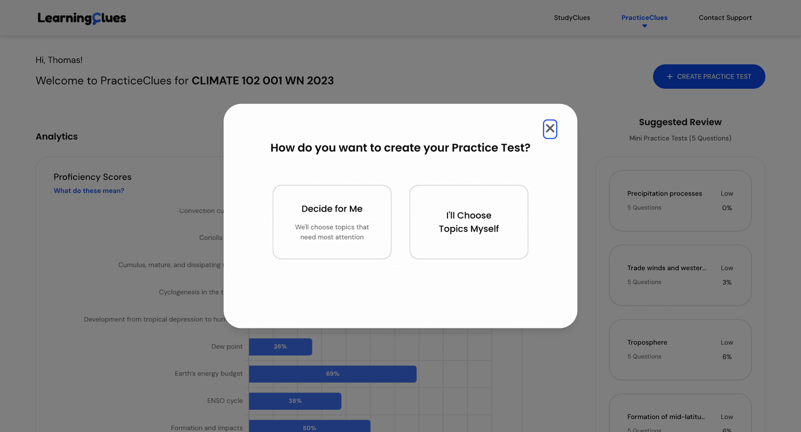 Decide for Me: Based on your past test history, PracticeClues will automatically determine which topics you need the most practice on and will recommend a test for you.