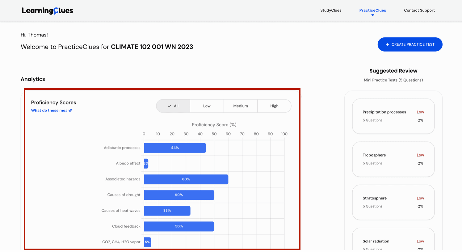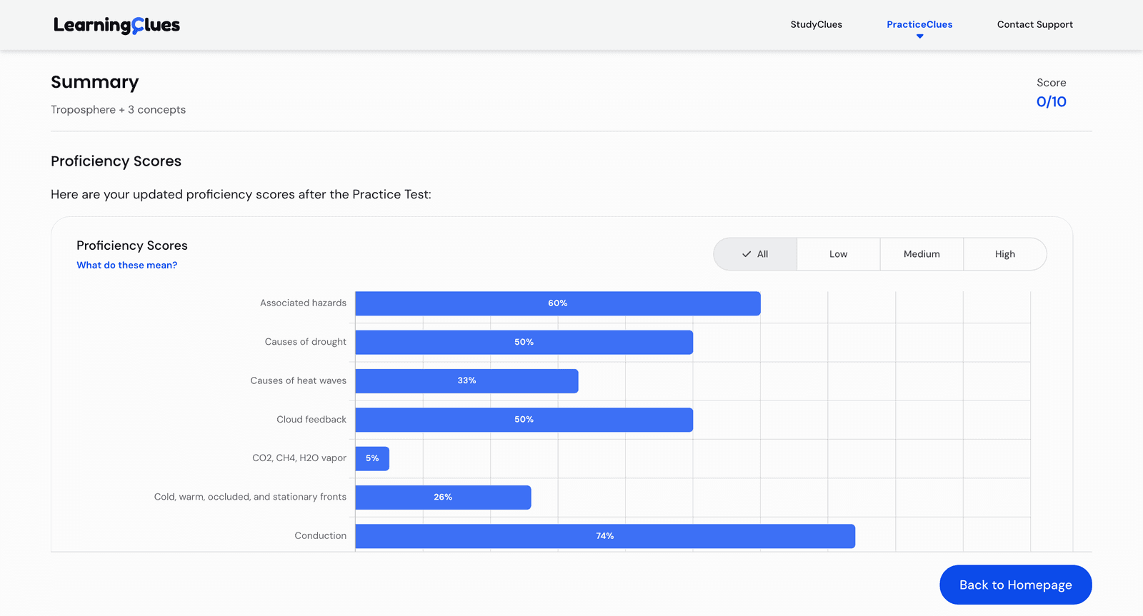 Proficiency Chart: A chart showing your proficiencies for all course concepts. You can sort them by low, medium, and high performance to easily identify areas for improvement.