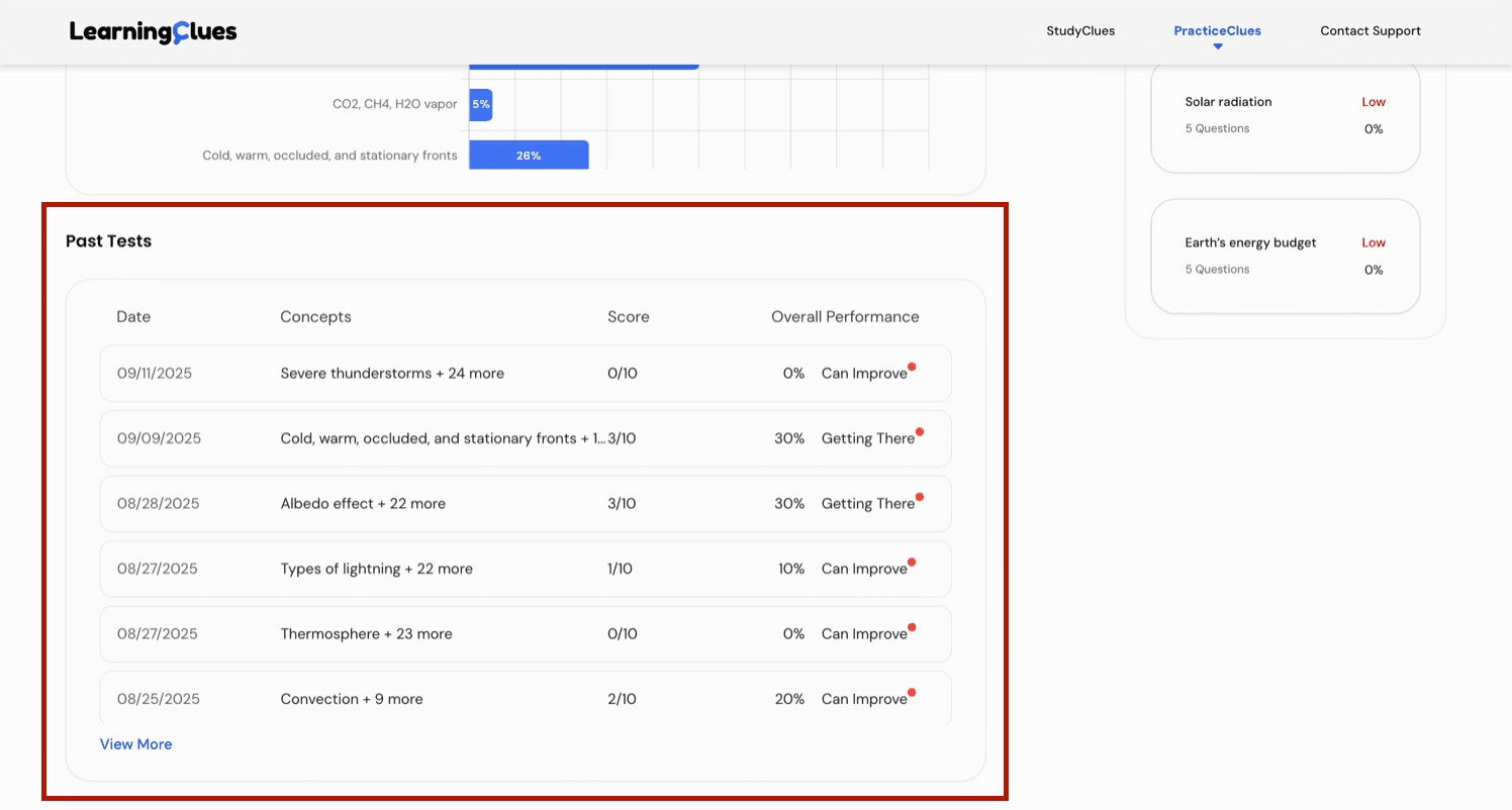 Practice Test History: A list of all the practice tests you have taken, showing the concepts covered, your score, and the date you took the test.