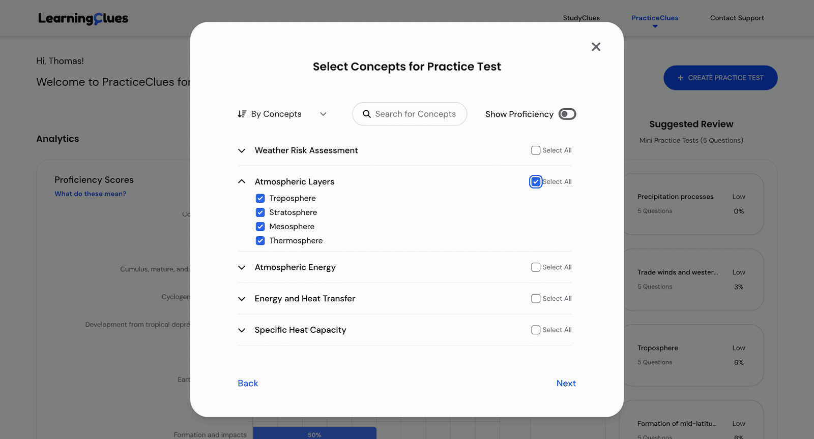 On the right side of the dashboard, you will find "Suggested review." This feature is based on your proficiencies and prioritizes the concepts where you have the lowest scores. It suggests a quick, 5-question quiz on a specific topic to help you improve your understanding. Clicking on one of these suggestions, like "Precipitation processes," will immediately start a quiz on that topic.