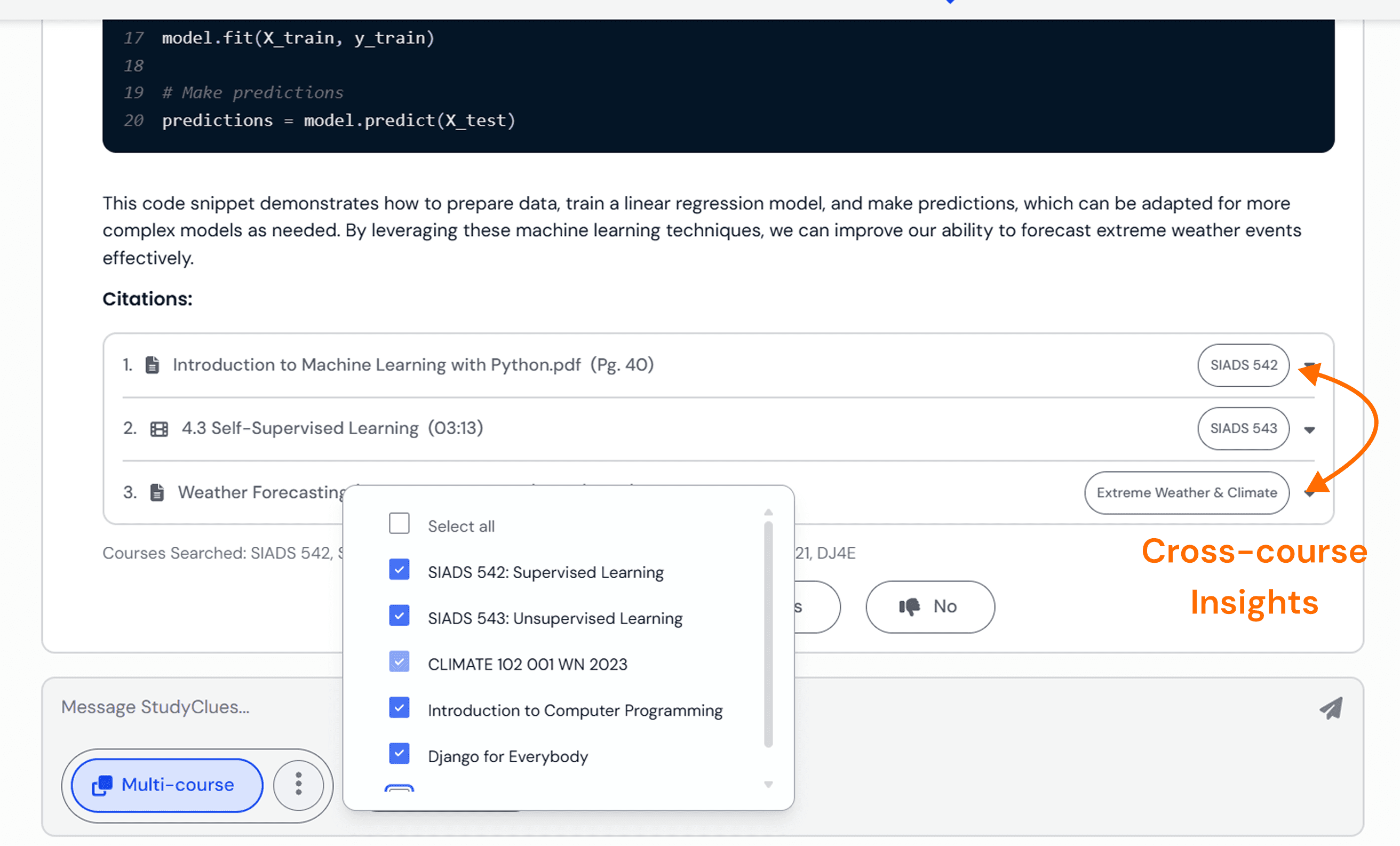 With Multi-Course Search, students can bring in pre-requisite knowledge from previous courses as well as learn the application of course concepts across multiple domains