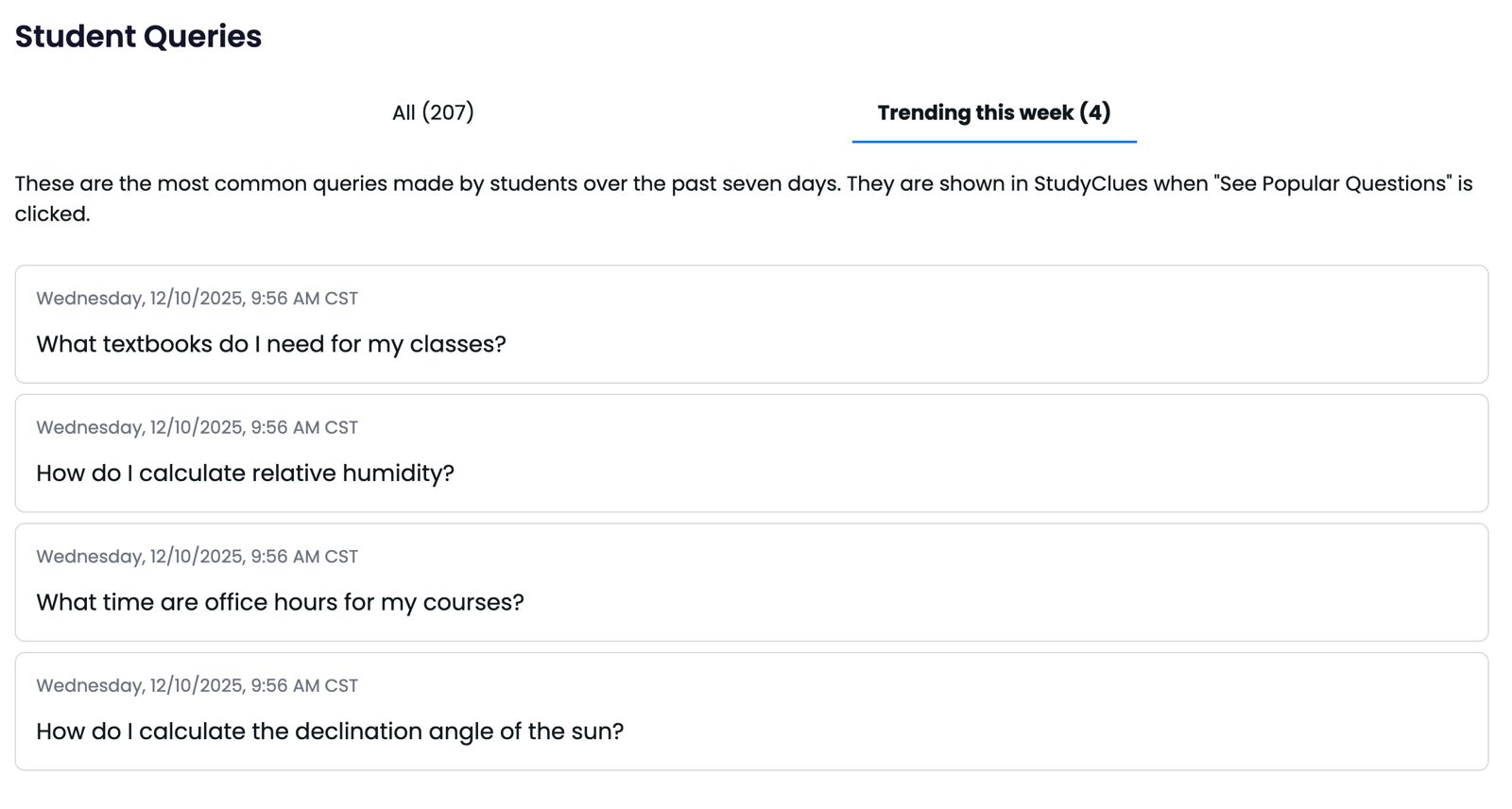 Instructors can view what students are asking (anonymously) and get insights into student performance. They can decide what content is used and accessed by LearningClues and turn off student access at any time.
